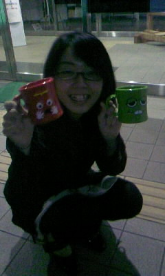 ステラからもらった、ガチャピンとムックのマグカップを持ってにこり☆