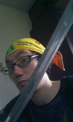 頭にタオル、鞄に刀。